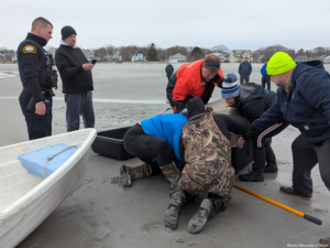 While en route, the MMoME team was in contact with Frank Orr, the Kennebunkport Harbormaster who brought his skiff to help access the seal. On arrival, the Kennebunkport Fire and Police Departments, and Maine Marine Patrol were also on scene to provide needed support. With the help of these partners, MMoME responders reached the seal and began to formulate an appropriate response. MMoME executive director, Lynda-Ada Doughty noted “our team is trained to be prepared for any situation at any time, anywhere within our response region of Kittery to Rockland, Maine. This situation is the perfect example of why it’s important to have an experienced, caring, authorized team to help at a moment’s notice.”