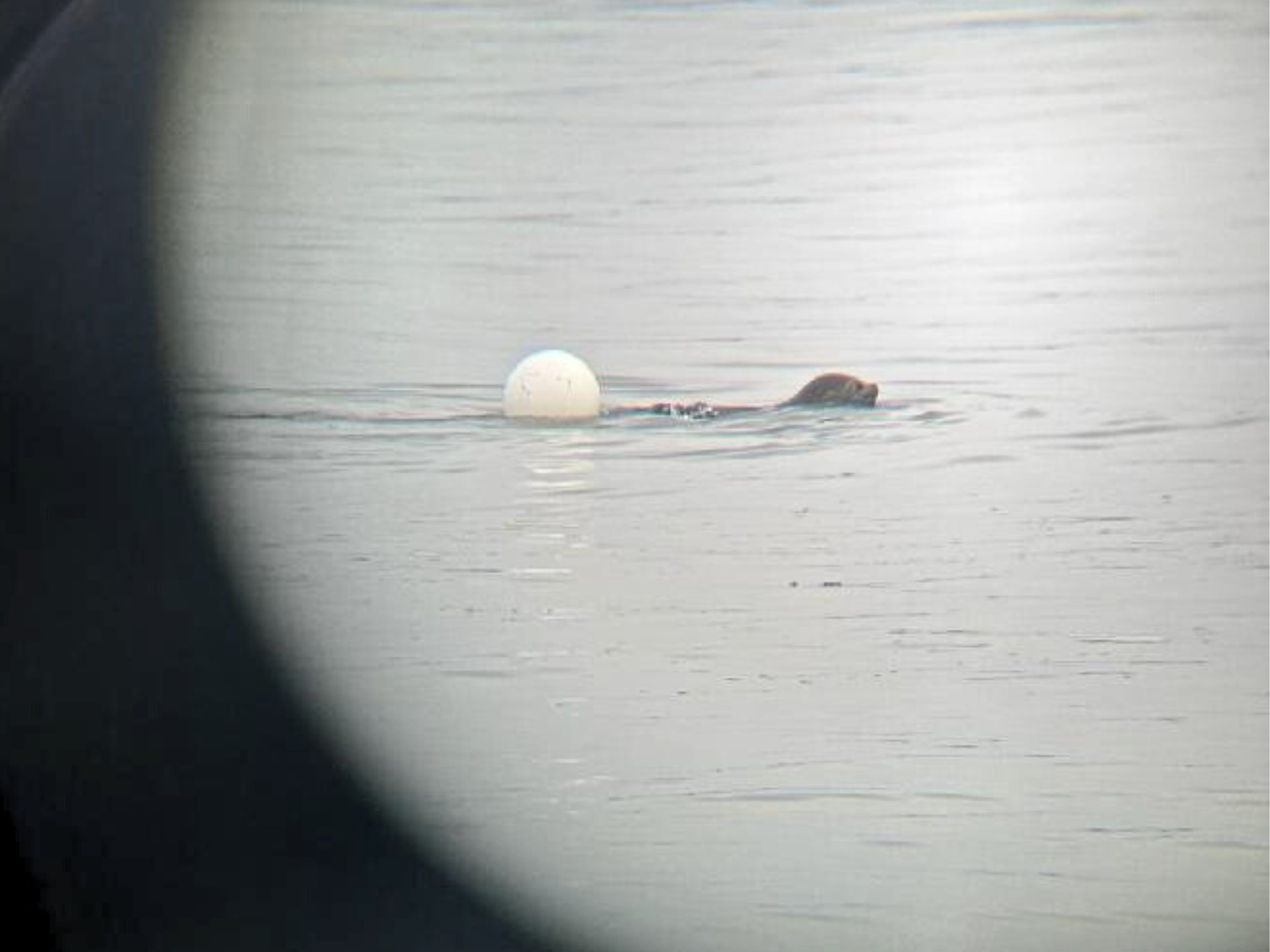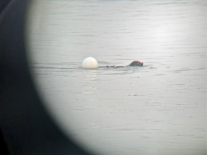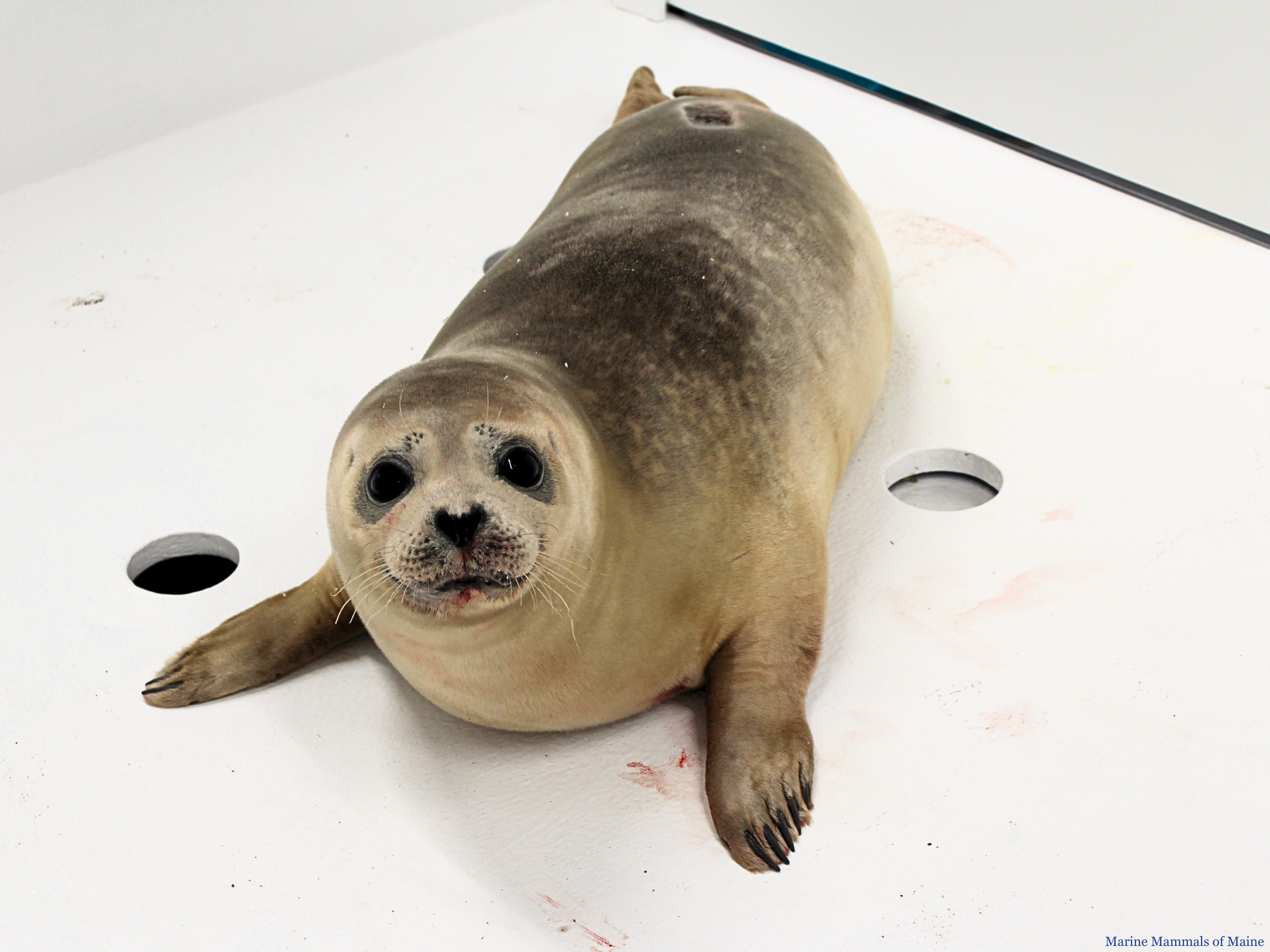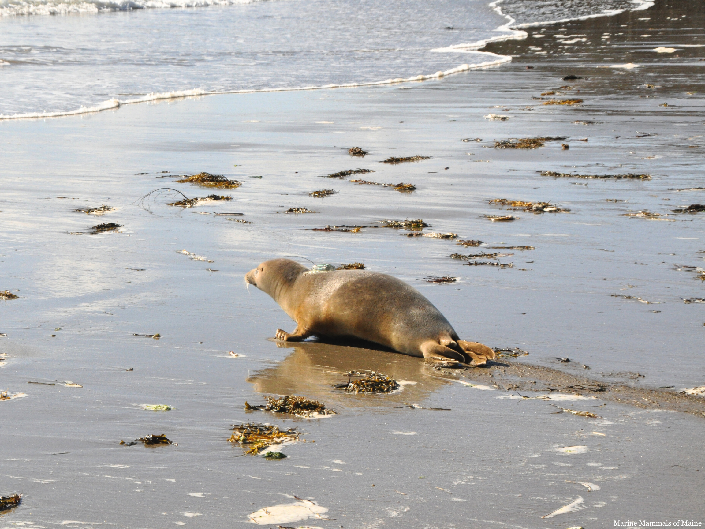 The initial evaluation revealed that the entangled seal was a sub-adult harbor seal who was wrapped in both rope and chain from a mooring ball line from its rear flipper up through his lower abdomen. His frantic efforts to free himself had worsened the situation, tightening the wraps to the extent that he had to be brought on the boat to remove it. Working together, two MMoME staff who are experienced in safely handling seals, and the Harbormaster, who focused on maneuvering the boat and the gear, successfully disentangled the animal. Once disentangled, the seal’s rear flipper was observed to be clear of external open injuries, but was significantly swollen and required further examination. With the help of the shore-based team, the seal was transferred to the beach, kenneled, and then transported to MMoME’s rehabilitation facility in Brunswick for an exam with the organization’s veterinarian. “The success of this case is the result of our caring community and committed town officials coming together for the common goal of helping this seal. We could not have gotten the seal back out to the wild without their help and we are grateful for the dedication of our community, particularly as national funding to support this work is currently zeroed out” added Doughty.