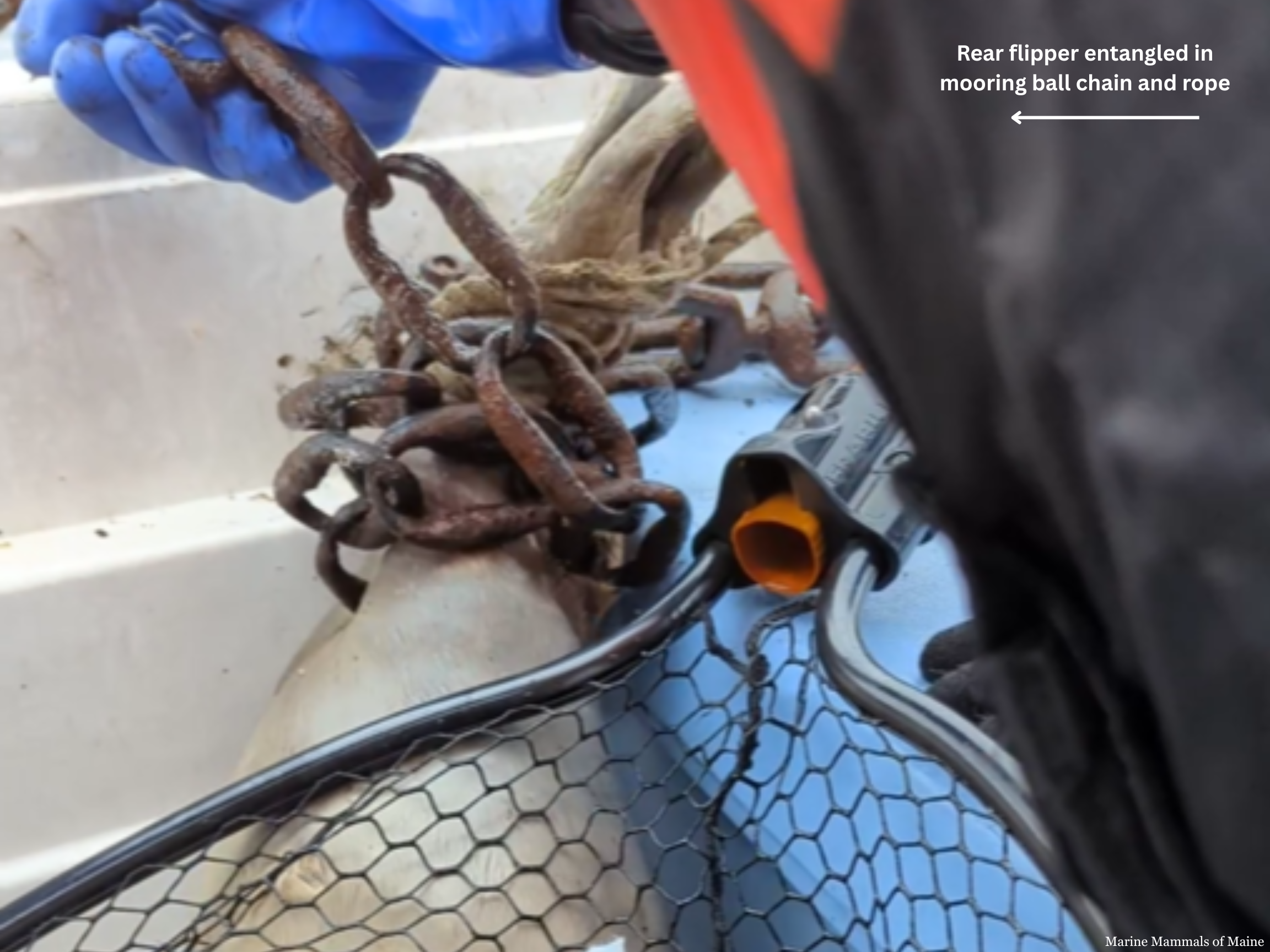On Monday, April 7, 2025 Marine Mammals of Maine (MMoME) received a call to their 24/7 stranding hotline reporting an unusual stranding case. A frantic seal appeared stuck and thrashing in a mooring line off Goose Rocks Beach in Kennebunkport, Maine. MMoME occasionally receives reports of entangled seals, though an entanglement of this nature is out of the ordinary. With only a short window before the tide would begin rising, a response was immediately initiated.