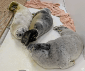 ![]() Three harbor seal pups currently in care getting some much needed rest. |