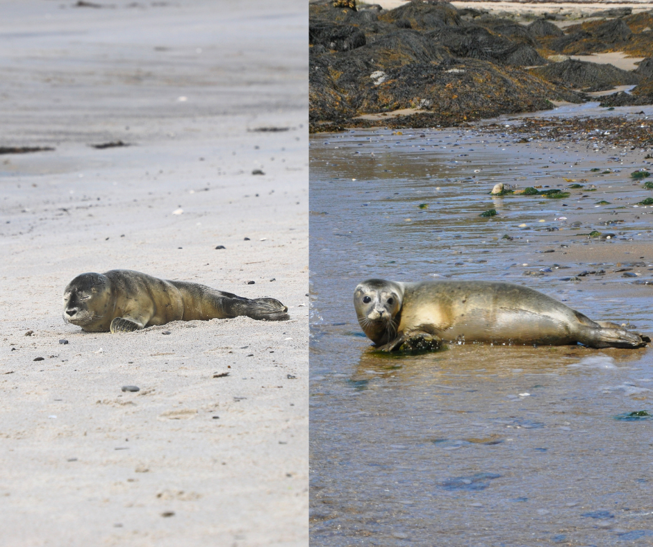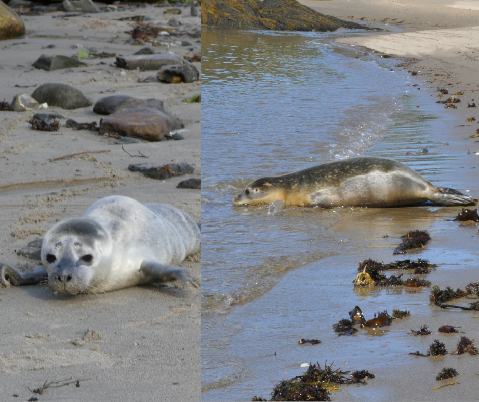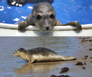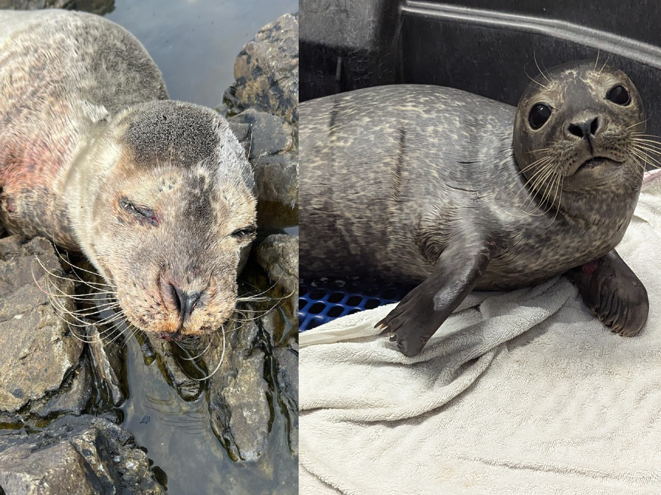 Above: a young harbor seal that stranded recently and sought refuge from the high surf on a beach in southern Maine. His before rescue and after starting care photos speak for themselves.