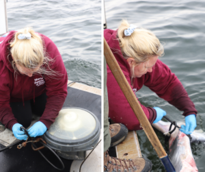 When deceased whales are floating offshore we conduct at-sea sampling to the best of our ability and in some cases, like this minke whale, we affix a tracking tag to monitor its movements and facilitate retrieval of the carcass and valuable data once it washes ashore.