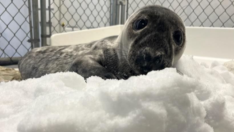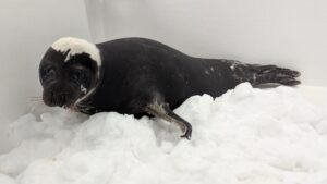 Pictured here is a gray seal pup found stranded and huddled in a thorn bush in Kennebunk earlier this month and an adult harp seal collected in Saco on President’s Day, which was the same day we collected an adult harp seal last year!